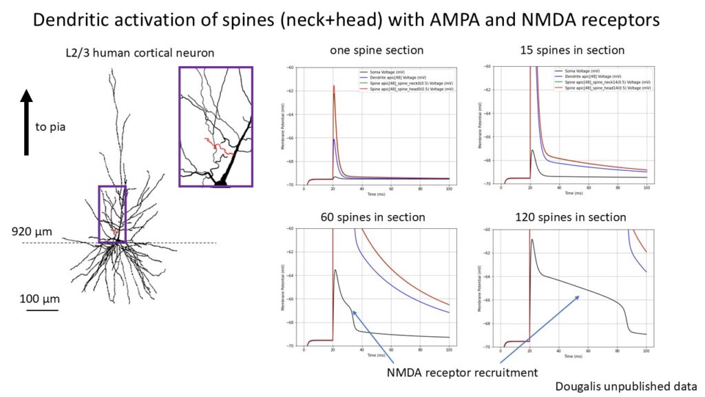As part of my ongoing commitment to neuroscience education, I’ve developed a biorealistic model of a human L2/3 cortical neuron in the NEURON simulation environment based on unpublished data in my lab. Morphological reconstruction was achieved in Neurolucida software following successful electrophysiological recording of the neuron and dye filling via biocytin. Ionic and synaptic mechanisms are coded in C style, then compiled and controlled by python! This model allows users to manipulate ionic properties, spine density, and the activation of synaptic receptors (AMPA and NMDA), and then observe how these factors influence neuronal firing.