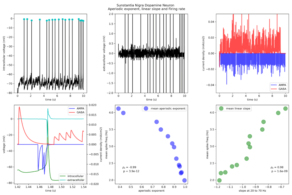 Finally, to follow up the results I have also correlated the firing rate with the extracted aperiodic exponent and linear slope on the active model. On the first row, I depict typical action potential firing of the model neuron (intracellular potentials and calculated extracellular potentials 200 micm away from the neuron, left and middle panel respectively) that arise from the stochastic train of AMPA and GABA activations (right panel). On the bottom row, I show an example of overlay of traces of the aforementioned experimental design (left panel) followed by the correlation (Spearman’s correlation rho and probability) of firing rate against aperiodic exponential (middle panel) and linear slope (right panel).