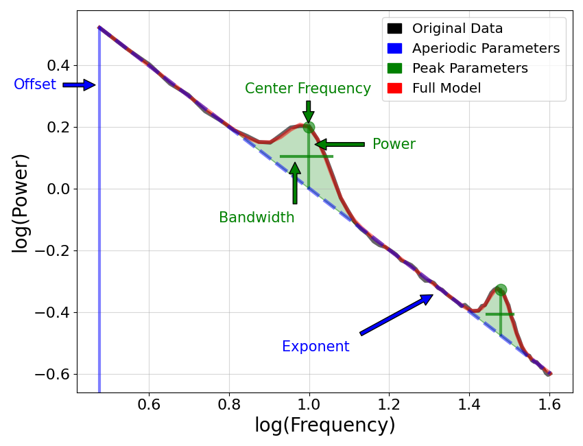In this formulation, the parameters b, k and x, , and define the aperiodic component, as: b is the broadband ‘offset’; k is the ‘knee’ of the spectrum ; x is the ‘exponent’ of the aperiodic fit; F is the array of frequency values