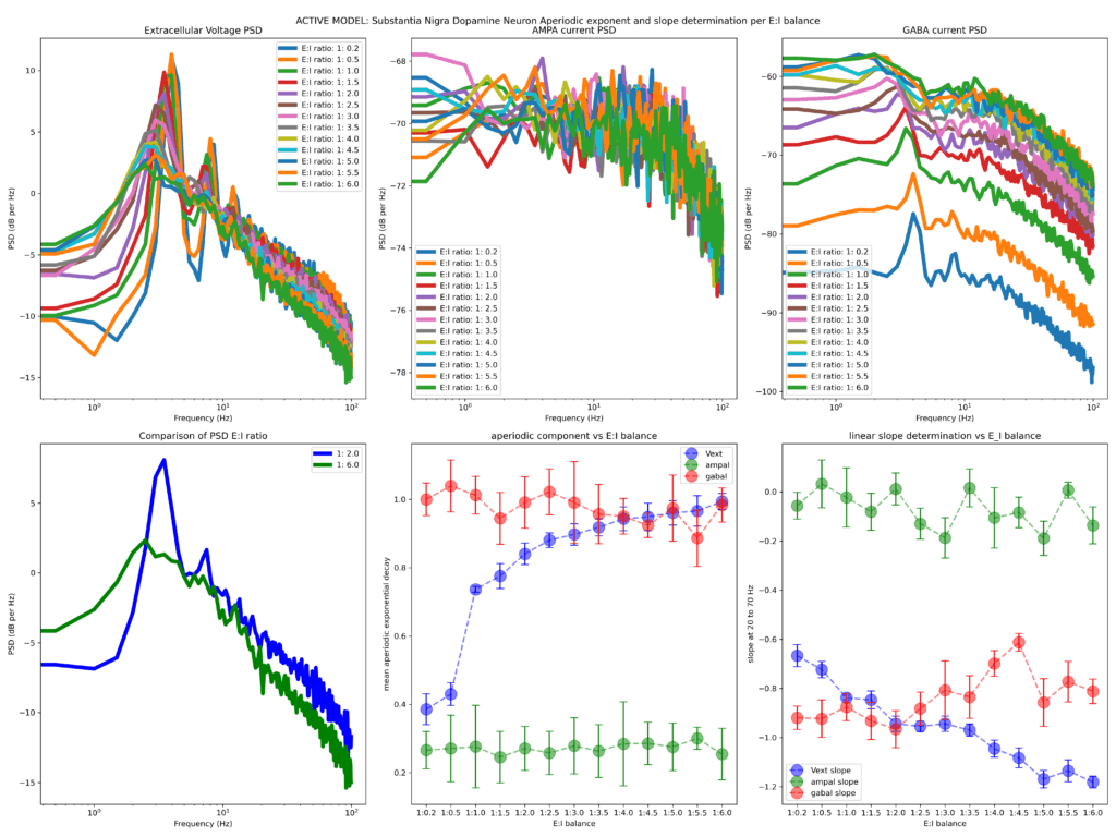 These results suggest that in a minimalistic single compartment model, inhibitory drive (and by extension E/I balance) is reflected on both the fitted aperiodic exponent and the slope determinants. These results seem to confirm the model of Gao and colleagues where more inhibition results in steeper PSD linear slopes. Is this the whole story then? By far no. In the next blog I will explore E)I balance and aperiodic parameters in a morphologically complex model of human cortical neuron.