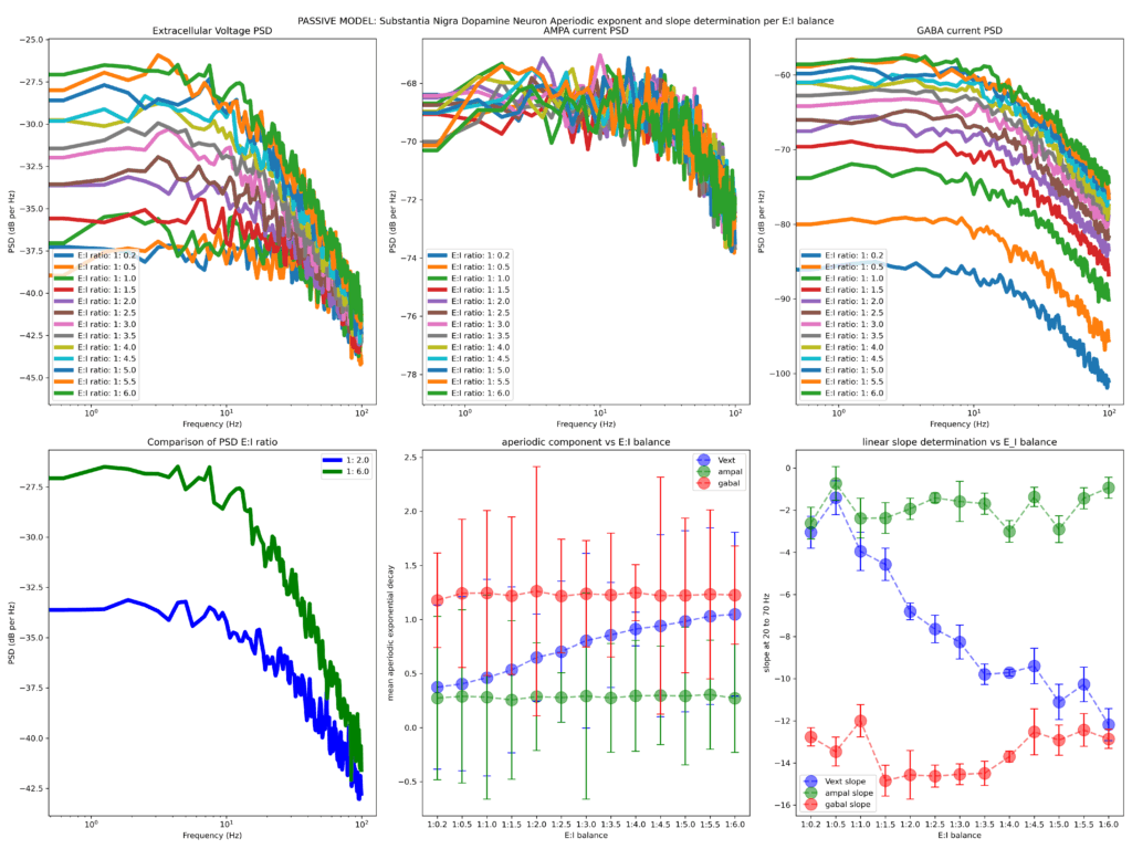 To simplify the matter and to follow the results of Gao et al., 2017, I have asked the following question. How does 1/f (aperiodic 1/f exponent and linear slope determination) change in a single compartment neuron bombarded by random excitation and varying strength of random inhibition? In other words how does the excitation inhibition balance looks at the cellular level in the most simple of cases.